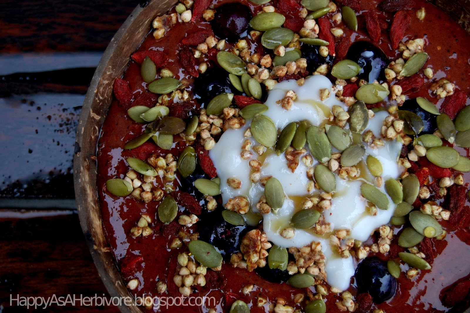 I topped my Goji Bowl with Coconut Butter, Buckini's, some extra goji berries, blue berries, linseeds, pepitas and a drizzle of maple syrup.